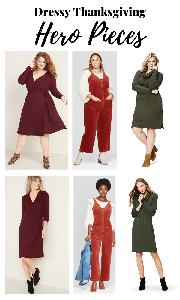 The wrap dress comes in 4 different colors with plus, straight, tall, and petite sizing available (bless you, Old Navy). It hits at your natural waist, so perfect for containing your food baby. We loooove this corduroy jumpsuit, easy enough to throw a long sleeve top underneath to keep you warm, and comfy enough to curl up on the couch to watch post-lunch football all afternoon. Finally, we found this sweater dress that is equal parts loose and comfortable. Dress (and warm!) it up with some OTK boots or cute tights and booties.
