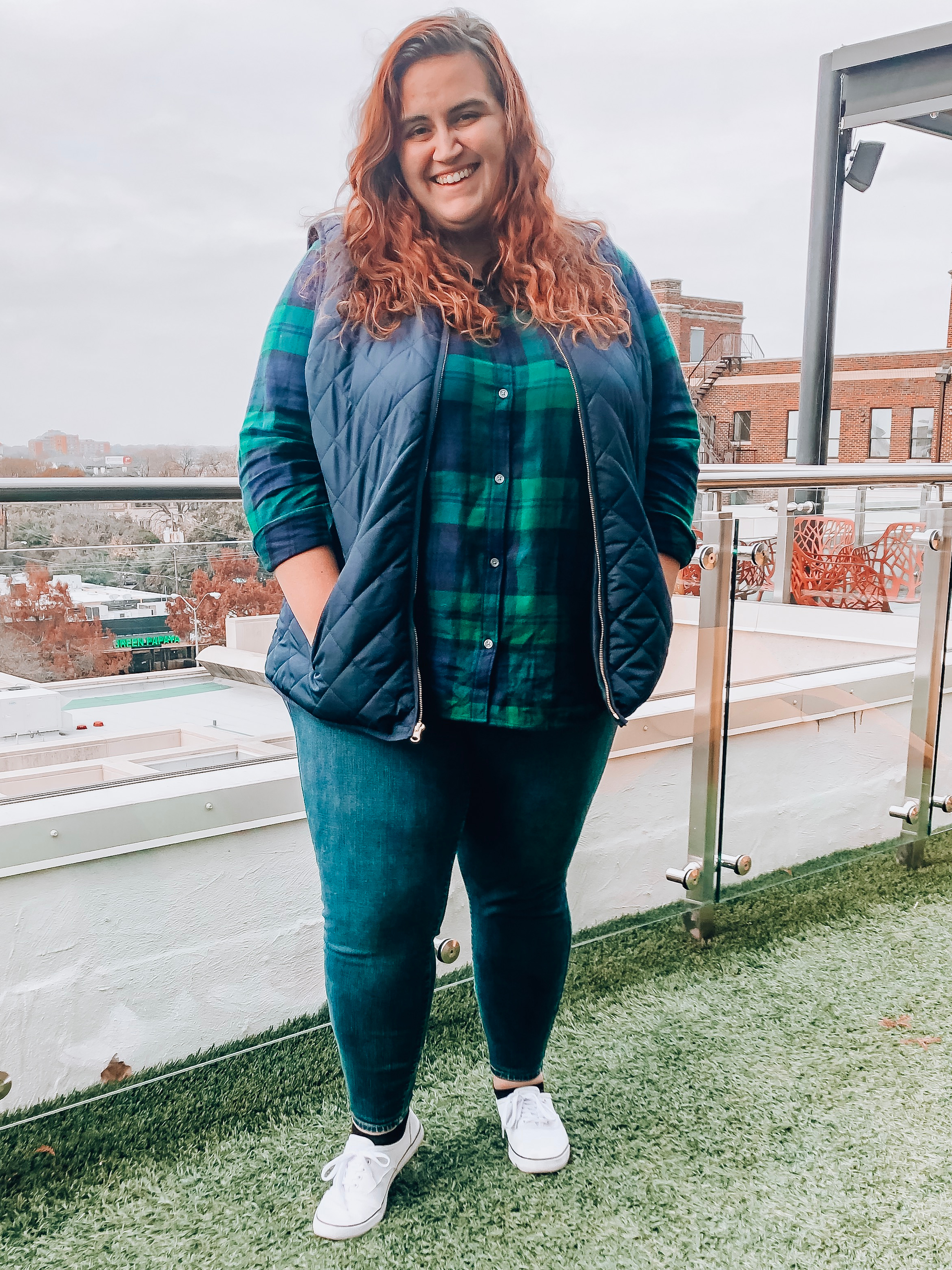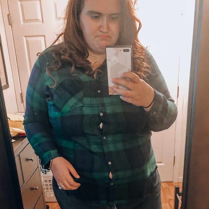 Remember how I said buttons can be a little tricky? Old Navy solves that problem by making their button down shirts “no-peek”—there are two buttons on the inside of these shirts in the chest area, preventing the awkward “my boobs are making the fabric in between the buttons start to pop out” moment. I own this flannel shirt in two colors, and I love it. I suggest sizing up: my flannels are both 3X.