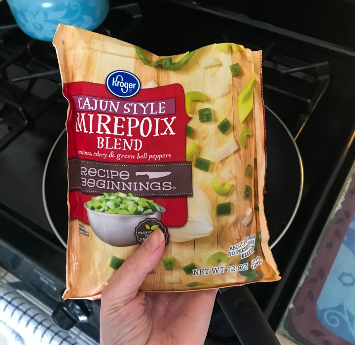 First you’re going to preheat your oven to 350 degrees Fahrenheit. While that’s heating up, add your frozen meat substitute and frozen veggies to a skillet with some oil or butter. I use fake chorizo for these which is already pretty oily and has a lot of seasoning so I didn’t have to add much here. If you are using something like meatless crumbles or just veggies, I recommend adding onion powder, garlic powder, salt, pepper, chili powder, and/or taco seasoning. I usually use a frozen pepper and onion blend but all Kroger had was mirepoix and it turned out fine. Any frozen veggie mix (and that you can convince your family to eat) you like will work. Stir occasionally until warmed through.
