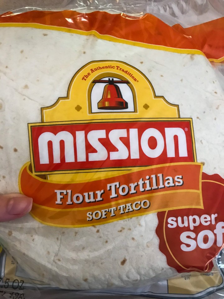 - Spread about three tablespoons of beans down the center of your top tortilla, followed by three tablespoons of corn, and then three tablespoons of your meat/veggie mixture.