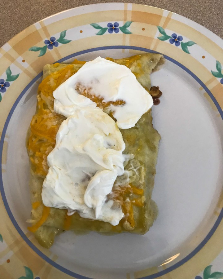 When they are done cooking, allow the enchiladas to sit for a few minutes so they don’t fall apart as you remove them from the pan. When they have cooled slightly, remove from the pan and add sour cream. Now eat up!