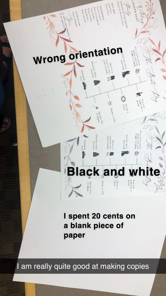 But then, I needed to print the dang things. Printing at a place like Fedex or Office Depot would be just as expensive as buying the program fans from a place online once I considered the cost of the glue and the sticks and the cardstock that I bought. So I asked instagram for advice, and instagram delivered: go to the public library! Here was my problem: I do not have an active library card. (The city of Dallas marked mine as expired a year after I got it and I hadn’t been in to renew it.) So I went with my dad who got me into the library in my hometown. We went to their printer upstairs, and then realized that… they only take cash. Quarters, to be exact. My dad went to the ATM while I figured out their printer, and he came back with handfuls of quarters. For some reason this was hilarious to us. We had many printing mishaps at the library, and it took so long, but he and I kept it light and fun and made it an adventure.