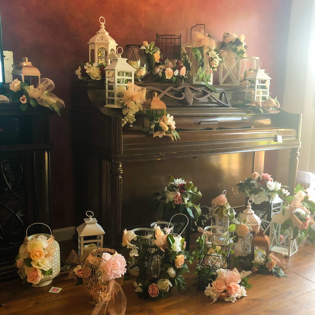 These were a labor of love. I buried my head in the sand with the decorations for the longest time, until I finally gave up control and (most of) my expectations to my mom. She took this job and ran with it, designing floral pieces out of silk flowers for the archway, the staircase I walked down, the aisle decor, and half of the reception table centerpieces (the other half of the centerpieces were bridesmaid bouquets). She did a phenomenal job. They were gorgeous, and really matched the vibe we were going for. But what really meant the most to me was the true labor of love and care my mom poured into the decor to make my wedding perfect. Yes, she was a total control freak about it, but she’s my control freak of a mom and I appreciate all of the love she poured into it more than I can say.
